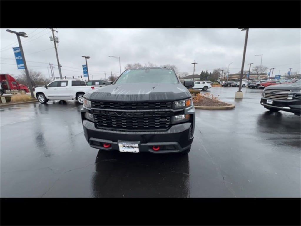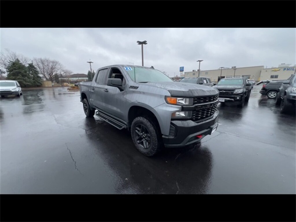 CarBravo Certified, 4WD, Trailering Package, Backup Camera, Remote Start, Pwr Dr Seat, Forward Collision Alert, Apple CarPlay, Carfax Buyback Guarantee, Step Boards, Silverado 1500 Custom Trail Boss, 4D Crew Cab, EcoTec3 5.3L V8, 6-Speed Automatic Electronic with Overdrive, 4WD, Satin Steel Metallic, Black Cloth, 170 Amp Alternator, 3.42 Rear Axle Ratio, 3.5" Diagonal Monochromatic Display, 4-Wheel Disc Brakes, 4.2" Diagonal Color Display Driver Info Center, 40/20/40 Front Split Bench Seat, 4G LTE Wi-Fi Hot Spot Capable, 6 Speakers, ABS brakes, Air Conditioning, Alloy wheels, Apple CarPlay/Android Auto, Auto-Locking Rear Differential, Automatic Emergency Braking, Auxiliary External Transmission Oil Cooler, Black Name Plates (LPO), Bluetooth® For Phone, Chevrolet Connected Access Capable, Cloth Seat Trim, Color-Keyed Carpeting Floor Covering, Compass, Custom Convenience Package, Dark Essentials Package (LPO), Deep-Tinted Glass, Delay-off headlights, Driver vanity mirror, Dual Exhaust w/Polished Outlets, Dual front impact airbags, Dual front side impact airbags, Electric Rear-Window Defogger, Electronic Cruise Control, Electronic Stability Control, EZ Lift Power Lock & Release Tailgate, Forward Collision Alert, Front Center Armrest w/Storage, Front Pedestrian Braking, Front reading lights, Front Rubberized Vinyl Floor Mats, Front wheel independent suspension, Fully automatic headlights, Heated door mirrors, Heavy-Duty Air Filter, High Gloss Black Grille, Hill Descent Control, Hitch Guidance, Illuminated entry, Infotainment Package, Integrated Trailer Brake Controller, LED Cargo Area Lighting, Low tire pressure warning, Manual Tilt Wheel Steering Column, Occupant sensing airbag, Off-Road Suspension w/2" Lift, OnStar & Chevrolet Connected Services Capable, Outside temperature display, Overhead airbag, Overhead console, Panic alarm, Passenger door bin, Passenger vanity mirror, Performance Red Recovery Hooks, Polished Exhaust Tip, Power Door Locks, Power door mirrors, Power Front Windows w/Driver Express Up/Down, Power Front Windows w/Passenger Express Down, Power Rear Windows w/Express Down, Power steering, Power windows, Preferred Equipment Group 2CX, Premium audio system: Chevrolet Infotainment 3, Rear 60/40 Folding Bench Seat (Folds Up), Rear reading lights, Rear Rubberized-Vinyl Floor Mats, Rear step bumper, Rear window defroster, Remote Keyless Entry, Remote Vehicle Starter System, Safety Confidence Package, Security system, SiriusXM Radio, Speed control, Speed-sensing steering, Split folding rear seat, Standard Tailgate, Steering Wheel Audio Controls, Suspension Package, Tachometer, Theft Deterrent System (Unauthorized Entry), Tilt steering wheel, Traction control, Trailering Package, Trip computer, Variably intermittent wipers, Voltmeter, Wheels: 18" x 8.5" Black Painted Aluminum. 2021 Chevrolet Silverado 1500 Satin Steel Metallic Custom Trail Boss 4D Crew Cab 4WD 6-Speed Automatic Electronic with Overdrive 13/18 City/Highway MPG EcoTec3 5.3L V8