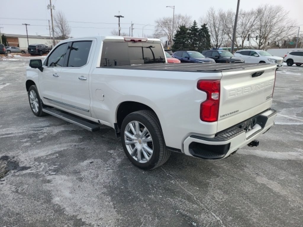 Low Miles, CarBravo Certified, 4WD, Leather Seats, Bucket Seats w/ Center Console, Premium Package, 22" Wheels, Sunroof, Trailering Package, Backup Camera, Carfax Buyback Guarantee, Silverado 1500 High Country, 4D Crew Cab, EcoTec3 5.3L V8, 10-Speed Automatic, 4WD, Iridescent Pearl Tricoat, Jet Black w/Perforated Leather-Appointed Front Seat Trim, 10-Way Power Driver Seat w/Lumbar, 10-Way Power Passenger Seat Adjuster w/Lumbar, 12.3" Multicolor Reconfigurable Digital Display, 120-Volt Instrument Panel Power Outlet, 15" Diagonal Multicolor Head-Up Display, 170 Amp Alternator, 2 USB Data Ports, 2nd Row Heated Outboard Seats, 3.23 Rear Axle Ratio, 4-Wheel Disc Brakes, ABS brakes, Adaptive Cruise Control, Adaptive Ride Control Suspension, Air Conditioning, All-Weather Floor Liner (LPO), AM/FM radio: SiriusXM with 360L, Auto High-beam Headlights, Auto-dimming door mirrors, Auto-Dimming Inside Rear-View Mirror, Auto-Locking Rear Differential, Automatic Emergency Braking, Automatic temperature control, Bed View Camera, Bluetooth® For Phone, Body-Color Painted Mirror Caps, Bodyside moldings, Brake assist, Bumpers: body-color, Chevrolet Connected Access Capable, Chevytec Spray-On Black Bedliner, Chrome Assist Steps, Chrome Recovery Hooks, Color-Keyed Carpeting Floor Covering, Compass, Deep-Tinted Glass, Driver door bin, Driver Memory, Driver vanity mirror, Dual Exhaust w/Polished Outlets, Dual front impact airbags, Dual front side impact airbags, Dual Rear USB Ports (Charge Only), Electric Rear-Window Defogger, Electrical Steering Column Lock, Electronic Cruise Control, Electronic Stability Control, Electronic Transmission Range Selector Shifter, Enhanced Automatic Emergency Braking, Floor Mounted Center Console, Following Distance Indicator, Forward Collision Alert, Front anti-roll bar, Front Bucket Seats, Front Carpeted Floor Mats, Front Center Armrest, Front dual zone A/C, Front fog lights, Front LED Fog Lamps, Front Pedestrian Braking, Front Rainsensing Wipers, Front reading lights, Front wheel independent suspension, Fully automatic headlights, Garage door transmitter, Genuine wood console insert, Genuine wood dashboard insert, Genuine wood door panel insert, HD Surround Vision, Heated door mirrors, Heated Driver & Front Outboard Passenger Seats, Heated Steering Wheel, High Capacity Suspension Package, High Country Premium Package, Hitch Guidance w/Hitch View, Illuminated entry, Integrated Trailer Brake Controller, IntelliBeam Automatic High Beam On/Off, Keyless Open & Start, Lane Keep Assist w/Lane Departure Warning, Leather Wrapped Steering Wheel, LED Cargo Area Lighting, Low tire pressure warning, Memory seat, Not Equipped w/Dynamic Fuel Management, Not Equipped w/Steering Column Lock, Occupant sensing airbag, OnStar & Chevrolet Connected Services Capable, Outside Heated Power-Adjustable Mirrors, Outside temperature display, Overhead airbag, Overhead console, Passenger door bin, Passenger vanity mirror, Perforated Leather Seat Trim, Perimeter Lighting, Power door mirrors, Power Front Passenger Windows w/Express Up/Down, Power Front Windows w/Driver Express Up/Down, Power Rear Windows w/Express Down, Power Sliding Rear Window w/Rear Defogger, Power Sunroof, Power Tailgate, Power Tilt & Telescoping Steering Column, Power-Retractable Assist Steps, Preferred Equipment Group 3LZ, Premium Bose 7-Speaker Sound System, Radio data system, Radio: Chevrolet Infotainment 3 Premium System, Rain sensing wipers, Rear Camera Mirror, Rear Carpeted Floor Mats, Rear Cross Traffic Alert-Braking, Rear Pedestrian Detection, Rear reading lights, Rear seat center armrest, Rear step bumper, Rear Wheelhouse Liners, Rear window defroster, Remote Vehicle Starter System, Safety Alert Seat, Security system, SiriusXM w/360L, Speed-sensing steering, Split folding rear seat, Standard Tailgate, Steering Wheel Audio Controls, Tachometer, Technology Package, Telescoping steering wheel, Theft Deterrent System (Unauthorized Entry), Tilt steering wheel, Traction co