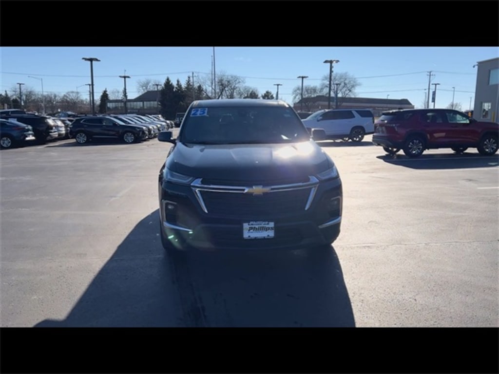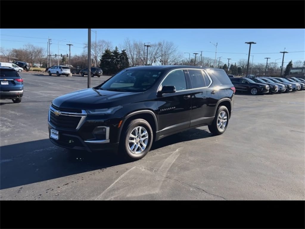 Low Miles, CarBravo Certified, Backup Camera, 8 Passenger Seating, Forward Collision Alert, Lane Departure Warning, Lane Change Alert, Lane Keep Assist, Apple CarPlay, Aluminum Wheels, Carfax Buyback Guarantee, Traverse LS, 4D Sport Utility, 3.6L V6 SIDI VVT, 9-Speed Automatic, FWD, Mosaic Black Metallic, Jet Black w/Premium Cloth Seat Trim, 2-Way Manual Front Passenger Seat Adjuster, 3rd row seats: split-bench, 4-Wheel Disc Brakes, 6-Speaker Audio System Feature, 6-Way Manual Driver Seat Adjuster, ABS brakes, Air Conditioning, AM/FM radio: SiriusXM, Apple CarPlay/Android Auto, Auto High-beam Headlights, Automatic temperature control, Brake assist, Bumpers: body-color, Compass, Driver door bin, Driver vanity mirror, Dual front impact airbags, Dual front side impact airbags, Electronic Stability Control, Emergency communication system, Exterior Parking Camera Rear, Four wheel independent suspension, Front anti-roll bar, Front Bucket Seats, Front Center Armrest, Front dual zone A/C, Front reading lights, Fully automatic headlights, Heated door mirrors, Illuminated entry, Low tire pressure warning, Occupant sensing airbag, Outside temperature display, Overhead airbag, Overhead console, Passenger door bin, Passenger vanity mirror, Power door mirrors, Preferred Equipment Group 1LS, Premium Cloth Seat Trim, Radio data system, Radio: Chevrolet Infotainment System AM/FM Stereo, Rear air conditioning, Rear anti-roll bar, Rear reading lights, Rear window defroster, Rear window wiper, Remote keyless entry, Security system, SiriusXM Radio, Speed control, Speed-sensing steering, Spoiler, Steering wheel mounted audio controls, Tachometer, Telescoping steering wheel, Tilt steering wheel, Traction control, Trip computer, Variably intermittent wipers, Voltmeter, Wheels: 18" Bright Silver Painted Aluminum. 2023 Chevrolet Traverse Mosaic Black Metallic LS 4D Sport Utility FWD 9-Speed Automatic 18/27 City/Highway MPG 3.6L V6 SIDI VVT