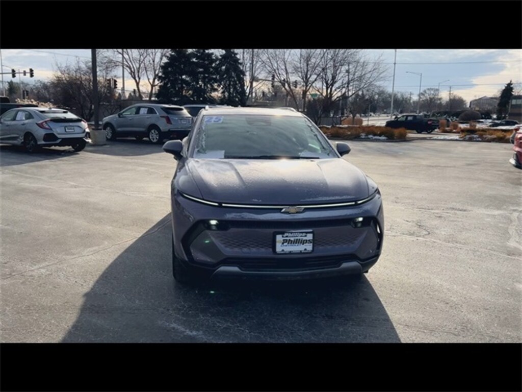 Low Miles, CarBravo Certified, Backup Camera, Remote Start, Pwr Dr Seat, Forward Collision Alert, Side Blind Zone Alert, Rear Cross Traffic Alert, Lane Departure Warning, Lane Change Alert, Lane Keep Assist, Heated Seats, Heated Steering Wheel, Power Liftgate, Apple CarPlay, Aluminum Wheels, Carfax Buyback Guarantee, Equinox EV LT, 4D Sport Utility, Electric Drive Unit, 1-Speed Automatic, FWD, Galaxy Gray Metallic, Black With Blue Accents Premium Synthetic, 19" Wheels, 4-Wheel Disc Brakes, 6-Speaker Audio System Feature, 6-Way Manual Front Passenger Seat Adjuster, 8-Way Power Driver Seat Adjuster, ABS brakes, Active Safety Package 2, Air Conditioning, AM/FM radio: SiriusXM with 360L, Ambient Multi-Color Interior Lighting, Auto High-beam Headlights, Automatic temperature control, Autosense Hands-Free Programmable Power Liftgate, Brake assist, Bright Roof Rails, Bumpers: body-color, Center Lit Bar Headlamps, Comfort Package, Compass, Convenience Package, Driver and Front Passenger Visors, Driver door bin, Dual front impact airbags, Dual front side impact airbags, Electronic Stability Control, Emergency communication system: OnStar and Chevrolet connected services capable, Enhanced Traffic Sign Recognition, Evotex Seat Trim, Four wheel independent suspension, Front anti-roll bar, Front Bucket Seats, Front Center Armrest, Front Passenger 4-Way Manual Seat Adjuster, Front reading lights, Fully automatic headlights, HD Surround Vision, Heated Automatic Steering Wheel, Heated Driver and Front Passenger Seats Cushion and Seatback, Heated Power-Adjustable Outside Mirrors, Hitch Guidance, Hitch View, Illuminated entry, Inside Rear-View Auto-Dimming Mirror, Knee airbag, Low tire pressure warning, Navigation system: Google built-in compatibility (select service plan required, terms and limitations apply), Occupant sensing airbag, Outside temperature display, Overhead airbag, Overhead console, Passenger door bin, Power door mirrors, Power Driver Lumbar Control, Power steering, Power Windows, Power windows, Preferred Equipment Group 2LT, Radio: 17.7" Diagonal Advanced Color LCD Display, Rear anti-roll bar, Rear Pedestrian Alert, Rear reading lights, Rear seat center armrest, Rear window defroster, Rear window wiper, Remote keyless entry, Round Bottom Wrapped Steering Wheel, Security system, SiriusXM with 360L Trial Subscription, Speed control, Split folding rear seat, Spoiler, Steering wheel mounted audio controls, Telescoping steering wheel, Tilt steering wheel, Traction control, Trip computer, Turn signal indicator mirrors, Variably intermittent wipers, Wireless Phone Charging. 2025 Chevrolet Equinox EV Galaxy Gray Metallic LT 4D Sport Utility FWD 1-Speed Automatic Electric Drive Unit