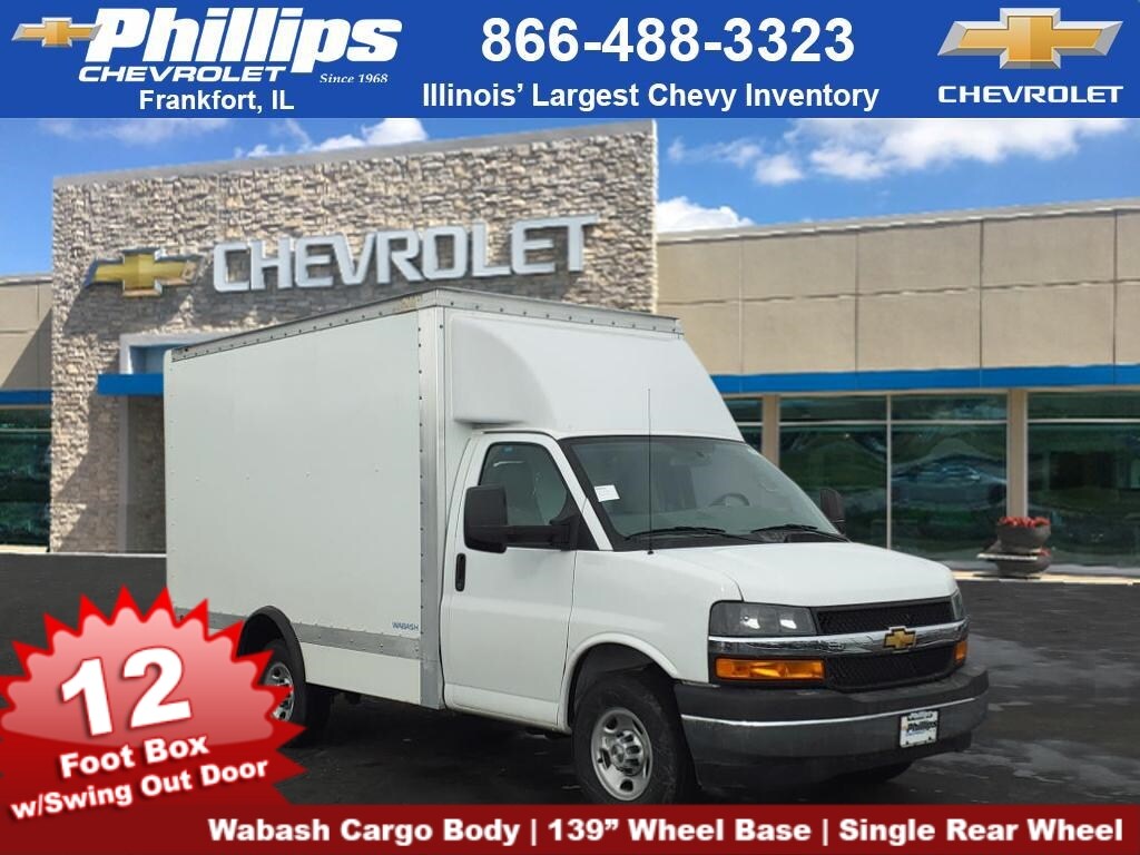 2024 Chevrolet Express 3500 Cutaway. 139" Wheelbase. 6.6L V8 gas engine. Single rear wheel 9,900 lb GVWR. Power windows, locks, tilt, cruise, chrome appearance. Wabash Supreme Cargo Body. Dual swing out rear doors.