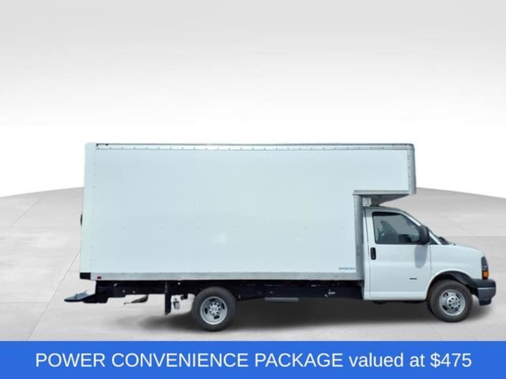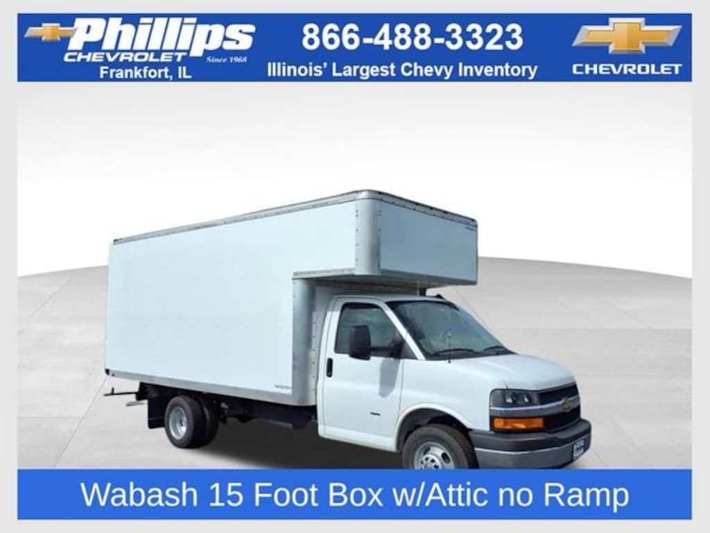 2025 Chevrolet Express 3500 Cutaway. 6.6L v8 gas engine, 12,300 lb GVWR Dual rear wheel. Wabash Supreme 15' box truck with over cab attic. No walk ramp.
