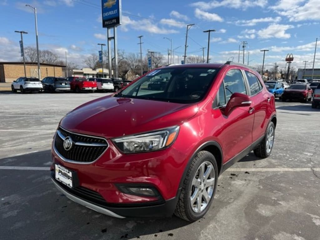 CarBravo Certified, No Added Cert. Fees, Sunroof, Apple CarPlay, Keyless Entry, Side Blind Zone Alert, Rear Cross Traffic Alert, Backup Camera, BLUETOOTH, Power Windows/Locks, Power Seating, PUSH BUTTON START!, Carfax Buyback Guarantee, Rear Traffic Alert, EXPERIENCE BUICK PACKAGE, Encore Preferred II, 4D Sport Utility, ECOTEC 1.4L I4 SMPI DOHC Turbocharged VVT, 6-Speed Automatic Electronic with Overdrive, FWD, Winterberry Red Metallic, Ebony Cloth, 120-Volt Power Outlet, 18 7-Spoke Chromed Aluminum Wheels, 2-Way Manual Front Passenger Seat Adjuster, 3.53 Final Drive Axle Ratio, 4-Wheel Disc Brakes, 6-Way Power Driver Seat Adjuster, ABS brakes, AM/FM radio: SiriusXM, Apple CarPlay/Android Auto, Auto-dimming Rear-View mirror, Automatic temperature control, Black Carbon Metallic Lower Exterior Accent Color, Brake assist, Bumpers: body-color, Cloth w/Leatherette Seat Trim, Compass, Delay-off headlights, Driver door bin, Driver vanity mirror, Driver's Seat Mounted Armrest, Dual front impact airbags, Dual front side impact airbags, Electronic Stability Control, Emergency communication system: OnStar Guidance, Experience Buick Package, Exterior Parking Camera Rear, Front anti-roll bar, Front Bucket Seats, Front dual zone A/C, Front Fog Lamps, Front fog lights, Front reading lights, Front wheel independent suspension, Fully automatic headlights, Heated door mirrors, Illuminated entry, Knee airbag, Low tire pressure warning, Occupant sensing airbag, Outside temperature display, Overhead airbag, Passenger door bin, Passenger vanity mirror, Power door mirrors, Power driver seat, Power Tilt-Sliding Moonroof, Preferred Equipment Group 1SD, Radio: Buick IntelliLink AM/FM Stereo, Rear Cross-Traffic Alert, Rear seat center armrest, Rear side impact airbag, Rear window defroster, Rear window wiper, Remote keyless entry, Remote Vehicle Starter System, Ride & Handling Suspension, Roof rack: rails only, Side Blind Zone Alert, Speed-sensing steering, Split folding rear seat, Spoiler, Steering wheel mounted audio controls, Tachometer, Telescoping steering wheel, Tilt steering wheel, Traction control, Trip computer, Turn signal indicator mirrors, Variably intermittent wipers. 2017 Buick Encore Winterberry Red Metallic Preferred II 4D Sport Utility FWD 6-Speed Automatic Electronic with Overdrive 25/33 City/Highway MPG ECOTEC 1.4L I4 SMPI DOHC Turbocharged VVT