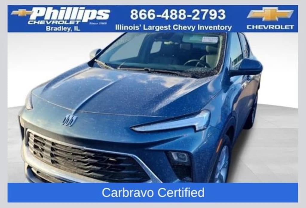 Carbravo Certified, Certifed Multi Point Inspection, One Owner, Carfax- Accident Free, Apple CarPlay, Back Up Camera, Bluetooth, Cruise Control, GAS SAVER, Forward Collision Alert, TURBO!, Carfax Buyback Guarantee, Encore GX Preferred, 4D Sport Utility, ECOTEC 1.2L Turbo, CVT, FWD, Ocean Blue Metallic, Ebony Seats With Ebony Interior Accents Cloth, 2 USB Ports (1 Type-A, 1 Type-C), 4-Way Manual Passenger Seat Adjuster, 4-Wheel Disc Brakes, 5.45 Final Drive Axle Ratio, 6 Speakers, 6-Way Manual Driver Seat Adjuster, ABS brakes, Air Conditioning, AM/FM radio: SiriusXM, Automatic temperature control, Brake assist, Bumpers: body-color, Cloth w/Leatherette Seat Trim, Compass, Driver door bin, Driver vanity mirror, Dual front impact airbags, Dual front side impact airbags, Electronic Stability Control, Emergency communication system: OnStar and Buick connected services capable, Enhanced Performance 6-Speaker System, Front anti-roll bar, Front Bucket Seats, Front Center Armrest, Front reading lights, Front wheel independent suspension, Fully automatic headlights, Heated door mirrors, Illuminated entry, Knee airbag, Low tire pressure warning, Occupant sensing airbag, Outside temperature display, Overhead airbag, Overhead console, Panic alarm, Passenger door bin, Passenger vanity mirror, Power door mirrors, Power steering, Power windows, Preferred Equipment Group 1SB, Radio data system, Radio: Audio System w/AM/FM, Rear reading lights, Rear side impact airbag, Rear window defroster, Rear window wiper, Remote keyless entry, Ride & Handling Suspension, Security system, SiriusXM, Speed control, Speed-sensing steering, Split folding rear seat, Spoiler, Steering wheel mounted audio controls, Tachometer, Telescoping steering wheel, Tilt steering wheel, Traction control, Trip computer, Variably intermittent wipers, Wheels: 18 Bright Silver Painted Aluminum, Wireless Apple CarPlay/Wireless Android Auto. CARFAX One-Owner. Clean CARFAX. Certified. Ocean Blue Metallic 2024 Buick Encore GX Preferred FWD CVT ECOTEC 1.2L TurboRecent Arrival! Odometer is 6107 miles below market average! 30/31 City/Highway MPGCertification Program Details: Type your description hereWith the internet today, a great value shouldn't be hard to find. Here at Phillips Chevrolet we do the research for you. We monitor the market daily to ensure our customers are getting the best value achievable. We price all of our vehicles to make the buying process as simple and easy as possible. Our internet prices are just one factor that makes us the #1, #2, and out to be the #3 Chevrolet dealerships in Illinois. The future #3 Chevy dealership in Illinois is conveniently located at 1400 Locke Drive, the corner of I-57 & IL 50, in Bradley/Bourbonnais, IL 60914.