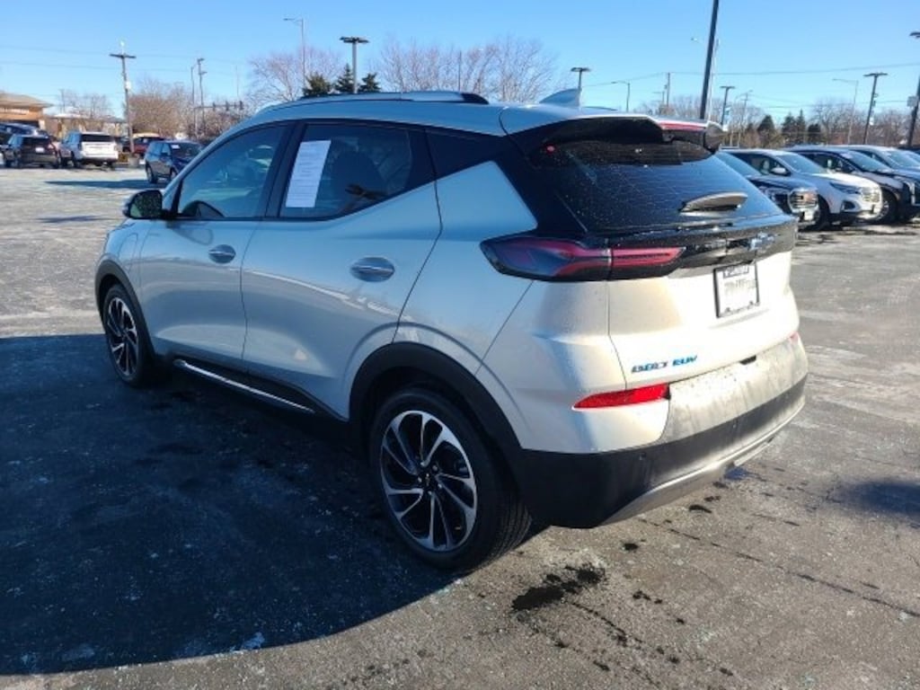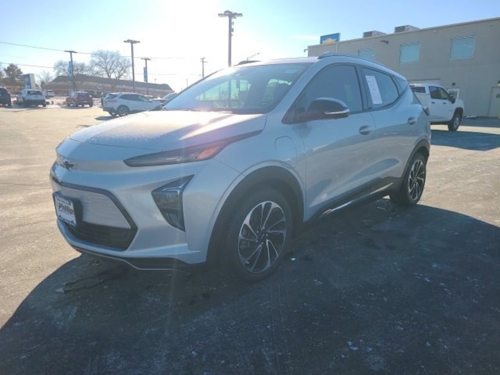 Low Miles, CarBravo Certified, Leather Seats, Panoramic Roof, Backup Camera, Remote Start, Pwr Dr Seat, Forward Collision Alert, Navigation, Bose Audio, Side Blind Zone Alert, Rear Cross Traffic Alert, Lane Departure Warning, Lane Change Alert, Lane Keep Assist, Rear Park Assist, Heated Seats, Heated Steering Wheel, Ventilated Seats, Apple CarPlay, Aluminum Wheels, Carfax Buyback Guarantee, Bolt EUV Premier, 4D Sport Utility, Electric Motor, 1-Speed Automatic, FWD, Silver Flare Metallic, Dark Ash Gray/Sky Cool Gray w/Perforated Leather-Appointed Seat Trim, 2-Way Power Driver Lumbar Seat Adjuster, 4-Wheel Disc Brakes, 6-Way Manual Passenger Seat Adjuster, 8-Way Power Driver Seat Adjuster, ABS brakes, Air Conditioning, AM/FM radio: SiriusXM with 360L, Apple CarPlay/Android Auto, Auto High-beam Headlights, Auto-dimming Rear-View mirror, Automatic temperature control, Bose Premium 7-Speaker Audio System, Brake assist, Bumpers: body-color, Compass, Driver door bin, Driver vanity mirror, Dual front impact airbags, Dual front side impact airbags, Electronic Stability Control, Emergency communication system: OnStar and Chevrolet connected services capable, Front anti-roll bar, Front Bucket Seats, Front Center Armrest, Front reading lights, Front wheel independent suspension, Fully automatic headlights, Heated door mirrors, Heated Driver & Front Passenger Seats, Heated rear seats, Heated steering wheel, Illuminated entry, Knee airbag, Low tire pressure warning, Navigation System, Occupant sensing airbag, Outside temperature display, Overhead airbag, Overhead console, Passenger door bin, Passenger vanity mirror, Perforated Leather-Appointed Seat Trim, Performance Ride & Handling Suspension, Power door mirrors, Power Dual Panel Panoramic Sunroof w/Slide, Preferred Equipment Group 2LZ, Premium audio system: Chevrolet Infotainment 3 Plus, Radio: Chevrolet Infotainment 3 Plus System w/Navi, Rain sensing wipers, Rear reading lights, Rear seat center armrest, Rear side impact airbag, Rear window defroster, Rear window wiper, Remote keyless entry, Roof rack: rails only, Security system, SiriusXM Radio w/360L, Speed control, Split folding rear seat, Steering wheel mounted audio controls, Sun & Sound Package, Telescoping steering wheel, Tilt steering wheel, Traction control, Trip computer, Turn signal indicator mirrors, Variably intermittent wipers, Ventilated Driver Seat, Ventilated Front Passenger Seat, Wheels: 17 Machined-Face Aluminum. 2022 Chevrolet Bolt EUV Silver Flare Metallic Premier 4D Sport Utility FWD 1-Speed Automatic 125/104 City/Highway MPG Electric Motor