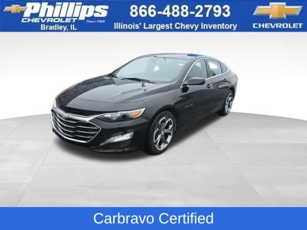 Carbravo Certified, One Owner, Apple CarPlay, Keyless Entry, Back Up Camera, Bluetooth, Cruise Control, Heated seats, Forward Collision Alert, Power Seating, Power Windows, Push Button Start, Remaining factory warranty, Remote start, Carfax Buyback Guarantee, Malibu LT 1LT, 4D Sedan, 1.5L DOHC, CVT, FWD, Mosaic Black Metallic, Jet Black w/Premium Cloth Seat Trim, 17 Aluminum Wheels, 6-Speaker Audio System Feature, ABS brakes, Apple CarPlay/Android Auto, Automatic temperature control, Brake assist, Bumpers: body-color, Compass, Delay-off headlights, Driver door bin, Driver vanity mirror, Electronic Stability Control, Emergency communication system: OnStar and Chevrolet connected services capable, Four wheel independent suspension, Front anti-roll bar, Front Bucket Seats, Front dual zone A/C, Front reading lights, Fully automatic headlights, Heated door mirrors, Heated Driver & Front Passenger Seats, Illuminated entry, Knee airbag, Low tire pressure warning, Occupant sensing airbag, Outside temperature display, Overhead airbag, Overhead console, Panic alarm, Passenger door bin, Passenger vanity mirror, Power door mirrors, Power Driver Lumbar Control Seat Adjuster, Power windows, Preferred Equipment Group 1LT, Premium audio system: Chevrolet Infotainment 3 Plus, Premium Cloth Seat Trim, Rear anti-roll bar, Rear reading lights, Rear seat center armrest, Rear side impact airbag, Rear window defroster, Remote keyless entry, Security system, Speed control, Split folding rear seat, Steering wheel mounted audio controls, Tachometer, Telescoping steering wheel, Tilt steering wheel, Traction control, Trip computer, Variably intermittent wipers, Voltmeter, Wireless Apple CarPlay/Android Auto. CARFAX One-Owner. Clean CARFAX. Certified. Mosaic Black Metallic 2023 Chevrolet Malibu LT 1LT FWD CVT 1.5L DOHCRecent Arrival! Odometer is 7065 miles below market average! 27/35 City/Highway MPGCertification Program Details: Type your description hereWith the internet today, a great value shouldn't be hard to find. Here at Phillips Chevrolet we do the research for you. We monitor the market daily to ensure our customers are getting the best value achievable. We price all of our vehicles to make the buying process as simple and easy as possible. Our internet prices are just one factor that makes us the #1, #2, and out to be the #3 Chevrolet dealerships in Illinois. The future #3 Chevy dealership in Illinois is conveniently located at 1400 Locke Drive, the corner of I-57 & IL 50, in Bradley/Bourbonnais, IL 60914.