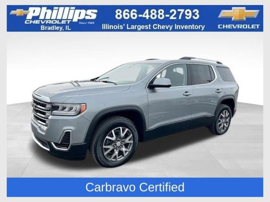 Carbravo Certified, One Owner, Apple CarPlay, Android Auto, Keyless Entry, Back Up Camera, Bluetooth, Heated seats, Forward Collision Alert, Intellibeam, Lane Assist, Pedestrian Monitoring, Power Locks, Power Windows, Push Button Start, Remote start, Front Park Assist, Rear Park Assist, Lane Change Alert, Carfax Buyback Guarantee, Acadia SLE, 4D Sport Utility, 2.0L Turbocharged, 9-Speed Automatic, FWD, Sterling Metallic, Jet Black w/Premium Cloth Seat Trim, 120-Volt Power Outlet, 3rd row seats: split-bench, 4-Way Manual Driver Seat Adjuster, 4-Way Manual Passenger Seat Adjuster, 4-Wheel Disc Brakes, 6-Passenger (2-2-2 Seating Configuration), 6-Speaker Audio System Feature, 8-Way Power Driver Seat Adjuster, ABS brakes, AM/FM radio: SiriusXM, Apple CarPlay/Android Auto, Auto High-beam Headlights, Automatic temperature control, Brake assist, Brushed Aluminum Roof Rails, Bumpers: body-color, Compass, Driver Convenience Package, Electronic Stability Control, Four wheel independent suspension, Front Bucket Seats, Front Center Armrest, Front dual zone A/C, Fully automatic headlights, Hands Free Power Programmable Liftgate, Heated door mirrors, Heated Driver & Front Passenger Seats, Illuminated entry, Outside temperature display, Overhead console, Passenger door bin, Passenger vanity mirror, Power door mirrors, Power Driver Lumbar Control Seat Adjuster, Preferred Equipment Group 3SA, Premium Cloth Seat Trim, Radio data system, Radio: AM/FM w/8 Diagonal Multi-Touch Display, Rear air conditioning, Rear window defroster, Rear window wiper, Remote Start, Security system, SiriusXM Radio, Speed control, Speed-sensing steering, Spoiler, Steering wheel mounted audio controls, Tachometer, Telescoping steering wheel, Tilt steering wheel, Traction control, Trip computer, Turn signal indicator mirrors, Variably intermittent wipers, Voltmeter, Wheels: 18 Machined Aluminum w/Dark Accents, Wireless Apple CarPlay/Wireless Android Auto. CARFAX One-Owner. Clean CARFAX. Certified. Sterling Metallic 2023 GMC Acadia SLE FWD 9-Speed Automatic 2.0L TurbochargedRecent Arrival! 22/29 City/Highway MPGCertification Program Details: Type your description hereWith the internet today, a great value shouldn't be hard to find. Here at Phillips Chevrolet we do the research for you. We monitor the market daily to ensure our customers are getting the best value achievable. We price all of our vehicles to make the buying process as simple and easy as possible. Our internet prices are just one factor that makes us the #1, #2, and out to be the #3 Chevrolet dealerships in Illinois. The future #3 Chevy dealership in Illinois is conveniently located at 1400 Locke Drive, the corner of I-57 & IL 50, in Bradley/Bourbonnais, IL 60914.
