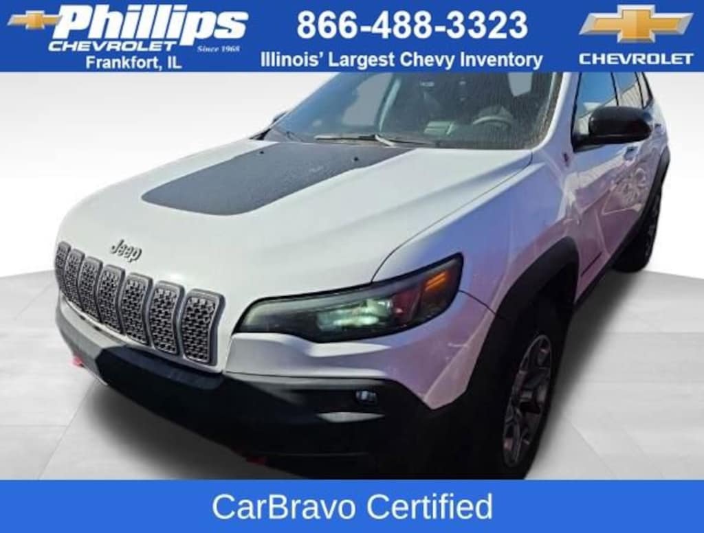 CarBravo Certified, 4WD, Backup Camera, Remote Start, Pwr Dr Seat, Forward Collision Alert, Side Blind Zone Alert, Rear Cross Traffic Alert, Lane Departure Warning, Heated Seats, Heated Steering Wheel, Power Liftgate, Apple CarPlay, Aluminum Wheels, Carfax Buyback Guarantee, Cherokee Trailhawk, 4D Sport Utility, 3.2L V6, 9-Speed 948TE Automatic, 4WD, Bright White Clearcoat, Black w/Cloth/Premium Vinyl Seats w/Pixel Play, 4-Wheel Disc Brakes, 6 Speakers, 8.4 Touchscreen Display, ABS brakes, AM/FM radio: SiriusXM, Anti-whiplash front head restraints, Apple CarPlay/Android Auto, Auto-Dimming Rear-View Mirror, Automatic temperature control, Brake assist, Cloth/Premium Vinyl Bucket Seats, Comfort/Convenience Group, Compass, Driver door bin, Driver vanity mirror, Dual front impact airbags, Dual front side impact airbags, Electronic Stability Control, Four wheel independent suspension, Front anti-roll bar, Front Bucket Seats, Front Center Armrest, Front dual zone A/C, Front fog lights, Front reading lights, Fully automatic headlights, Google Android Auto, GPS Antenna Input, Hands-Free Power Liftgate, Heated door mirrors, Heated front seats, Heated steering wheel, Illuminated entry, K-Black Door Trim Panel Appliques, K-Black Interior Accents, Knee airbag, Leather Shift Knob, Low tire pressure warning, Occupant sensing airbag, Off Road Suspension, Outside temperature display, Overhead airbag, Overhead console, ParkView Rear Back-Up Camera, Passenger door bin, Passenger vanity mirror, Power door mirrors, Power driver seat, Quick Order Package 27E, Radio data system, Radio: Uconnect 4 w/8.4 Display, Rain sensing wipers, Rear anti-roll bar, Rear reading lights, Rear seat center armrest, Rear side impact airbag, Rear window defroster, Rear window wiper, Remote keyless entry, Roof rack: rails only, Security Alarm, SiriusXM Satellite Radio, Speed control, Speed-sensing steering, Split folding rear seat, Spoiler, Steering wheel mounted audio controls, Tachometer, Telescoping steering wheel, Tilt steering wheel, Traction control, Trip computer, Turn signal indicator mirrors, Universal Garage Door Opener, USB Host Flip, Variably intermittent wipers, Voltmeter, Wheels: 17 x 7.5 Painted Diamond Cut Aluminum. 2022 Jeep Cherokee Bright White Clearcoat Trailhawk 4D Sport Utility 4WD 9-Speed 948TE Automatic 18/24 City/Highway MPG 3.2L V6