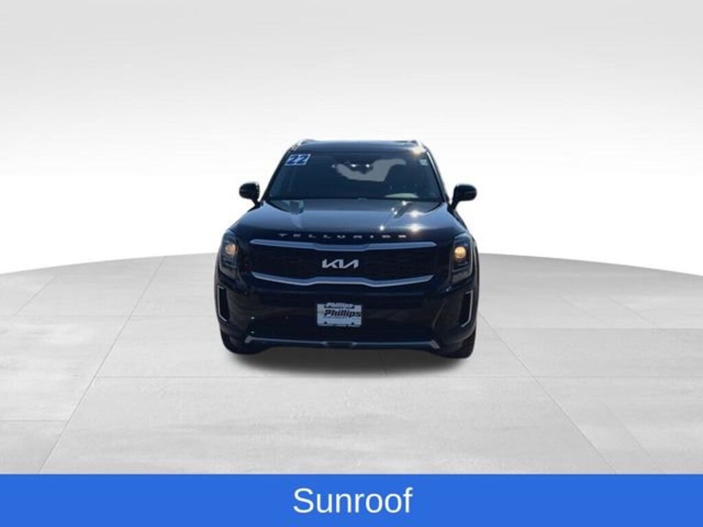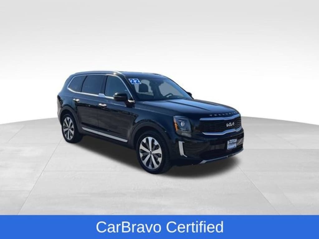 CarBravo Certified, Sunroof, Backup Camera, Pwr Dr Seat, Forward Collision Alert, Navigation, Side Blind Zone Alert, Rear Cross Traffic Alert, Lane Keep Assist, Heated Seats, Apple CarPlay, 20 Wheels, Carfax Buyback Guarantee, Telluride S, 4D Sport Utility, 3.8L V6 DOHC, 8-Speed Automatic, FWD, Ebony Black, Black w/Synthetic Leather Seat Trim, 20 x 7.5 Machined Alloy Wheels, 3rd row seats: split-bench, 4-Wheel Disc Brakes, 6 Speakers, ABS brakes, Air Conditioning, Apple CarPlay & Android Auto, Automatic temperature control, Brake assist, Bumpers: body-color, Driver door bin, Driver vanity mirror, Dual front impact airbags, Dual front side impact airbags, Electronic Stability Control, Emergency communication system: 911 Connect, Four wheel independent suspension, Front anti-roll bar, Front Center Armrest, Front dual zone A/C, Front reading lights, Fully automatic headlights, Heated door mirrors, Heated Front Bucket Seats, Illuminated entry, Knee airbag, Leather Shift Knob, Leather steering wheel, Low tire pressure warning, Navigation System, Occupant sensing airbag, Outside temperature display, Overhead airbag, Overhead console, Passenger door bin, Passenger vanity mirror, Power door mirrors, Power driver seat, Power moonroof, Radio data system, Radio: AM/FM Display Audio System, Rear air conditioning, Rear anti-roll bar, Rear audio controls, Rear reading lights, Rear window defroster, Rear window wiper, Remote keyless entry, Security system, Smart Key w/ Push Button and Remote Start, Speed control, Speed-sensing steering, Split folding rear seat, Spoiler, Steering wheel mounted audio controls, Synthetic Leather Seat Trim, Tachometer, Telescoping steering wheel, Tilt steering wheel, Traction control, Trip computer, Turn signal indicator mirrors, Variably intermittent wipers. 2022 Kia Telluride Ebony Black S 4D Sport Utility FWD 8-Speed Automatic 20/26 City/Highway MPG 3.8L V6 DOHC