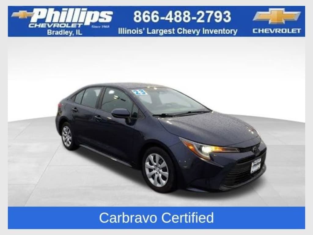 Carbravo Certified, One Owner, Keyless Entry, Back Up Camera, Bluetooth, Cruise Control, Lane Assist, Power Locks, Power Windows, Push Button Start, Carfax Buyback Guarantee, Corolla LE, 4D Sedan, 2.0L I4 DOHC 16V, CVT, FWD, Blueprint/Midnight Black Metallic, Black w/SofTex Seat Trim, 4-Wheel Disc Brakes, AM/FM radio: SiriusXM, Auto High-beam Headlights, Automatic temperature control, Brake assist, Delay-off headlights, Dual front impact airbags, Dual front side impact airbags, Electronic Stability Control, Emergency communication system: Safety Connect (up to 10-year trial subscription), Exterior Parking Camera Rear, Front anti-roll bar, Front Bucket Seats, Front Center Armrest, Front wheel independent suspension, Fully automatic headlights, Knee airbag, Low tire pressure warning, Occupant sensing airbag, Overhead airbag, Premium Fabric Seat Trim, Radio: 8 Toyota Audio Multimedia, Rear anti-roll bar, Rear side impact airbag, Rear window defroster, Remote keyless entry, Split folding rear seat, Steering wheel mounted audio controls, Tachometer, Telescoping steering wheel, Tilt steering wheel, Traction control, Trip computer, Variably intermittent wipers. CARFAX One-Owner. Clean CARFAX. Certified. Blueprint/Midnight Black Metallic 2023 Toyota Corolla LE FWD CVT 2.0L I4 DOHC 16V