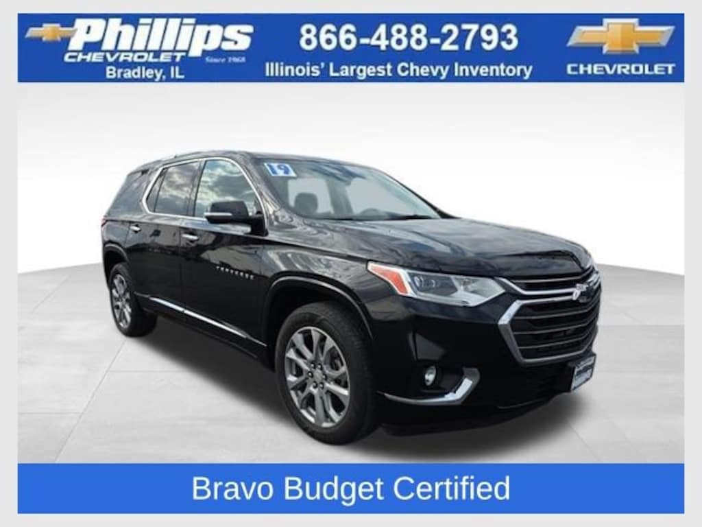 Bravo Budget Certified, One Owner, Apple CarPlay, Android Auto, Keyless Entry, AWD, Back Up Camera, Blind Spot Monitoring, Bluetooth, BOSE Audio, Hands-Free Easy Open Power Liftgate, Heated Rear Seats, Heated seats, Heated steering wheel, Forward Collision Alert, Intellibeam, Lane Assist, Pedestrian Monitoring, Power lift gate, Power Locks, Power Seating, Power Windows, Push Button Start, Rear Traffic Alert, Remote start, Ventilated seats, Carfax Buyback Guarantee, DUAL SKYSCAPE SUNROOF, Traverse Premier, 4D Sport Utility, 3.6L V6 SIDI VVT, 9-Speed Automatic, AWD, Mosaic Black Metallic, Seats, Front Bucket Leather, 10 Speakers, 3rd row seats: split-bench, 7-Passenger Seating (2-2-3 Seating Configuration), Apple CarPlay/Android Auto, Auto High-beam Headlights, Auto-dimming Rear-View mirror, Automatic temperature control, Bose Premium 10-Speaker Audio System Feature, Brake assist, Compass, Delay-off headlights, Electronic Stability Control, Front Bucket Seats, Front dual zone A/C, Front fog lights, Fully automatic headlights, Garage door transmitter, Heated door mirrors, Heated front seats, Heated rear seats, Heated steering wheel, Illuminated entry, Memory seat, Outside temperature display, Panic alarm, Perforated Leather-Appointed Seat Trim, Power driver seat, Power Liftgate, Power passenger seat, Premium audio system: Chevrolet MyLink, Rear air conditioning, Rear window defroster, Remote keyless entry, Security system, Speed control, Steering wheel memory, Tachometer, Telescoping steering wheel, Tilt steering wheel, Trip computer, Ventilated front seats, Voltmeter. CARFAX One-Owner. Clean CARFAX. Certified. Mosaic Black Metallic 2019 Chevrolet Traverse Premier AWD 9-Speed Automatic 3.6L V6 SIDI VVT