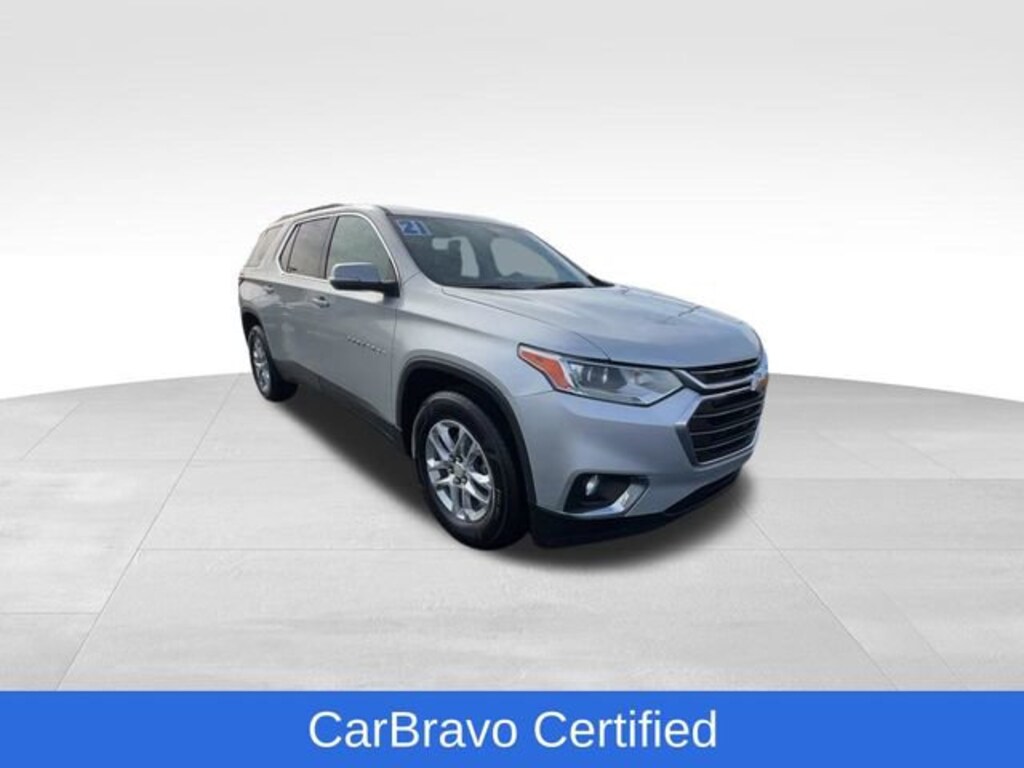 CarBravo Certified, AWD, Trailering Package, Backup Camera, Remote Start, 7 Passenger Seating, Pwr Dr Seat, Side Blind Zone Alert, Rear Cross Traffic Alert, Lane Change Alert, Rear Park Assist, Heated Seats, Power Liftgate, Apple CarPlay, Aluminum Wheels, Carfax Buyback Guarantee, Traverse LT 1LT, 4D Sport Utility, 3.6L V6 SIDI VVT, 9-Speed Automatic, AWD, Silver Ice Metallic, Jet Black w/Premium Cloth Seat Trim, 3rd row seats: split-bench, 4-Wheel Disc Brakes, 6 Speakers, 7-Passenger Seating (2-2-3 Seating Configuration), ABS brakes, Air Conditioning, AM/FM radio: SiriusXM, Apple CarPlay/Android Auto, Automatic temperature control, Brake assist, Bumpers: body-color, Compass, Driver door bin, Driver vanity mirror, Dual front impact airbags, Dual front side impact airbags, Electronic Stability Control, Emergency communication system: OnStar and Chevrolet connected services capable, Four wheel independent suspension, Front anti-roll bar, Front Bucket Seats, Front Center Armrest, Front dual zone A/C, Front fog lights, Front reading lights, Fully automatic headlights, Garage door transmitter, Heated door mirrors, Heated front seats, Heavy-Duty Cooling System, High-Intensity Discharge Headlights, Hitch Guidance w/Hitch View, Illuminated entry, Leather steering wheel, Low tire pressure warning, Occupant sensing airbag, Outside temperature display, Overhead airbag, Overhead console, Passenger door bin, Passenger vanity mirror, Power door mirrors, Power driver seat, Power Liftgate, Preferred Equipment Group 1LT, Premium Cloth Seat Trim, Radio: Chevrolet Infotainment 3 Plus System, Rear air conditioning, Rear anti-roll bar, Rear reading lights, Rear window defroster, Rear window wiper, Remote keyless entry, Security system, SiriusXM w/360L, Speed control, Speed-sensing steering, Spoiler, Steering wheel mounted audio controls, Tachometer, Telescoping steering wheel, Tilt steering wheel, Traction control, Trailering Assist Guidelines, Trailering Equipment, Trip computer, Turn signal indicator mirrors, Variably intermittent wipers, Voltmeter, Wheels: 18 Bright Silver Painted Aluminum. 2021 Chevrolet Traverse Silver Ice Metallic LT 4D Sport Utility 1LT AWD 9-Speed Automatic 17/25 City/Highway MPG 3.6L V6 SIDI VVT