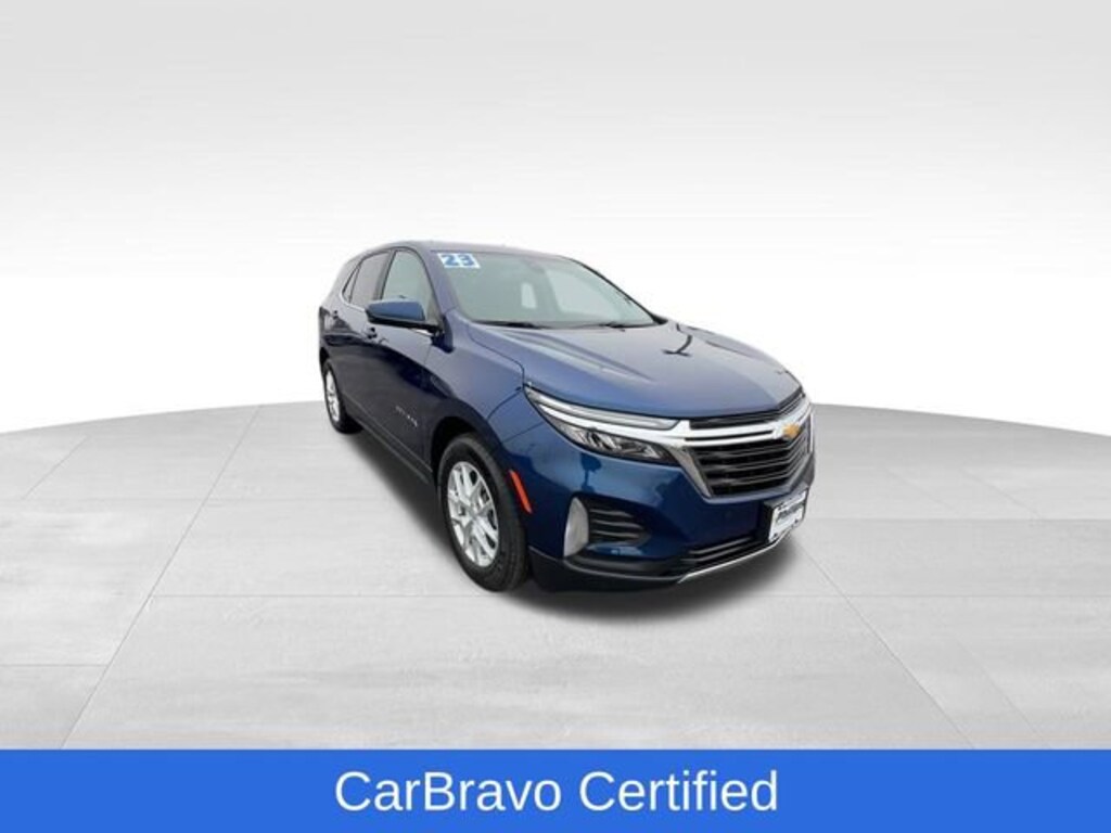 CarBravo Certified, Backup Camera, Remote Start, Pwr Dr Seat, Forward Collision Alert, Side Blind Zone Alert, Rear Cross Traffic Alert, Lane Departure Warning, Lane Change Alert, Lane Keep Assist, Front & Rear Park Assist, Heated Seats, Power Liftgate, Apple CarPlay, Aluminum Wheels, Carfax Buyback Guarantee, Equinox LT, 4D Sport Utility, 1.5L DOHC, 6-Speed Automatic Electronic with Overdrive, FWD, Blue Glow Metallic, Jet Black w/Premium Cloth Seat Trim, 17 Aluminum Wheels, 2 Rear USB Charging-Only Ports, 2 USB Ports & Auxiliary Input Jack, 2-Way Power Driver Lumbar Control Seat Adjuster, 4-Wheel Disc Brakes, 6-Speaker Audio System Feature, ABS brakes, Air Conditioning, AM/FM radio: SiriusXM, Auto High-beam Headlights, Bluetooth® For Phone, Brake assist, Bumpers: body-color, Cold Air Grille Shutter, Compass, Confidence & Convenience Package, Driver 8-Way Power Seat Adjuster, Driver Confidence II Package, Driver Convenience Package, Driver door bin, Driver vanity mirror, Dual front impact airbags, Dual front side impact airbags, Dual-Zone Automatic Climate Control, Electronic Stability Control, Emergency communication system: OnStar and Chevrolet connected services capable, Four wheel independent suspension, Front & Rear Park Assist, Front anti-roll bar, Front Bucket Seats, Front Center Armrest, Front Passenger 4-Way Manual Seat Adjuster, Front reading lights, Fully automatic headlights, Heated door mirrors, Heated Driver & Front Passenger Seats, Illuminated entry, Lane Change Alert w/Side Blind Zone Alert, Low tire pressure warning, Occupant sensing airbag, Outside temperature display, Overhead airbag, Overhead console, Passenger door bin, Passenger vanity mirror, Power door mirrors, Power driver seat, Preferred Equipment Group 1LT, Premium audio system: Chevrolet Infotainment 3, Premium Cloth Seat Trim, Radio data system, Radio: Chevrolet Infotainment 3 System w/AM/FM, Rear anti-roll bar, Rear Cross Traffic Alert, Rear Power Liftgate, Rear reading lights, Rear seat center armrest, Rear window defroster, Rear window wiper, Remote Start, Security system, Side Blind Zone & Rear Cross Traffic, SiriusXM Radio, Speed control, Speed-sensing steering, Split folding rear seat, Spoiler, Steering wheel mounted audio controls, Tachometer, Telescoping steering wheel, Tilt steering wheel, Traction control, Trip computer, Variably intermittent wipers, Wireless Apple CarPlay/Wireless Android Auto, Wrapped Steering Wheel. 2023 Chevrolet Equinox Blue Glow Metallic LT 4D Sport Utility FWD 6-Speed Automatic Electronic with Overdrive 26/31 City/Highway MPG 1.5L DOHC