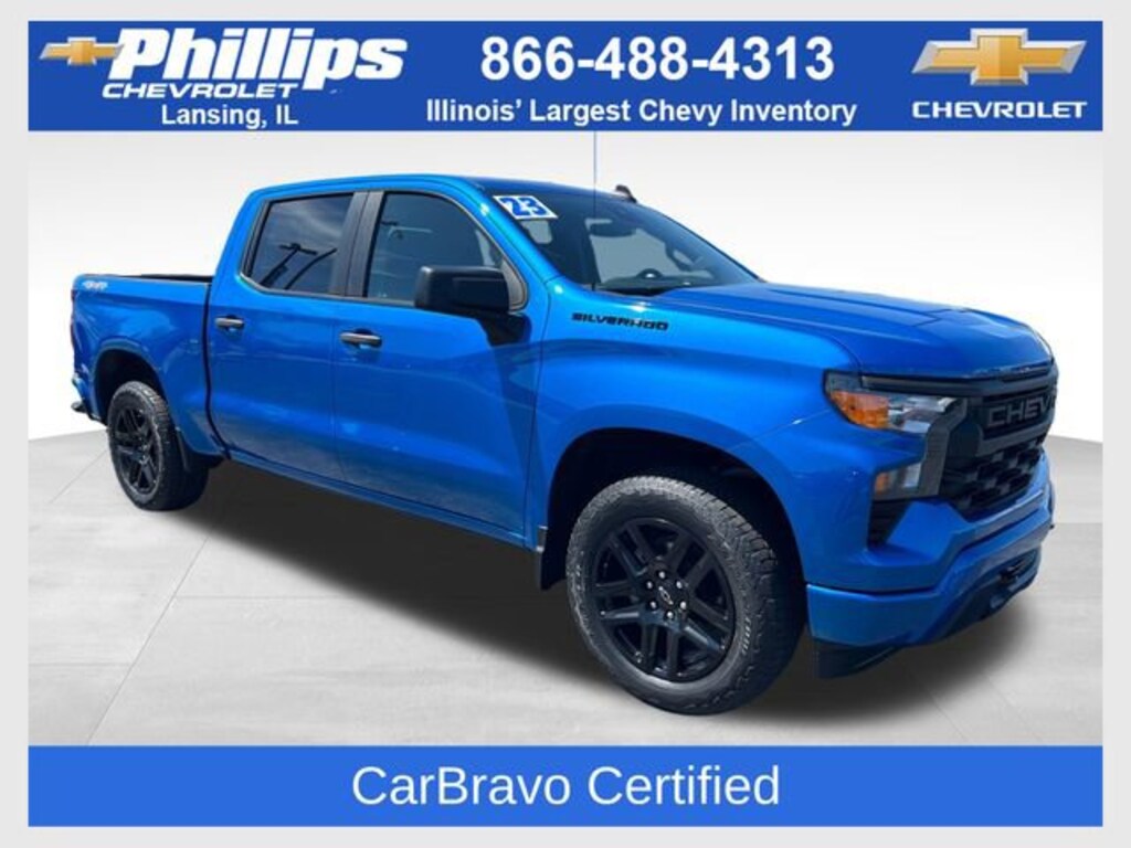 CarBravo Certified, 4WD!, TRAILERING EQUIPMENT, 20 Wheels!, Carfax Buyback Guarantee, Silverado 1500 Custom, 4D Crew Cab, 2.7L Turbo, 8-Speed Automatic, 4WD, Glacier Blue Metallic, Jet Black w/Cloth Seat Trim, 10-Way Power Driver Seat w/Lumbar, 120-Volt Instrument Panel Power Outlet, 3.5 Monochromatic Display Driver Info Center, 4-Wheel Disc Brakes, 40/20/40 Front Split-Bench Seat, 6-Speaker Audio System, ABS brakes, Air Conditioning, AM/FM radio: SiriusXM, Apple CarPlay/Android Auto, Auto High-beam Headlights, Automatic Emergency Braking, Black Name Plates (LPO), Bluetooth® For Phone, Brake assist, Bumpers: body-color, Chevrolet Connected Access Capable, Chevytec Spray-On Black Bedliner, Cloth Seat Trim, Color-Keyed Carpeting Floor Covering, Compass, Custom Convenience Package, Custom Value Package, Dark Essentials Package (LPO), Deep-Tinted Glass, Dual Rear USB Ports (Charge Only), Electric Rear-Window Defogger, Electronic Cruise Control, Electronic Stability Control, EZ Lift Power Lock & Release Tailgate, Following Distance Indicator, Forward Collision Alert, Front Center Armrest w/Storage, Front Frame-Mounted Black Recovery Hooks, Front Pedestrian Braking, Fully automatic headlights, HD Rear Vision Camera, Heated door mirrors, High Capacity Suspension Package, Hitch Guidance, Illuminated entry, IntelliBeam Automatic High Beam On/Off, Lane Keep Assist w/Lane Departure Warning, LED Cargo Area Lighting, Manual Tilt Wheel Steering Column, Multi-Flex Tailgate, OnStar & Chevrolet Connected Services Capable, Outside temperature display, Overhead console, Passenger door bin, Passenger vanity mirror, Power door mirrors, Power Front Windows w/Driver Express Up/Down, Power Front Windows w/Passenger Express Down, Power Rear Windows w/Express Down, Preferred Equipment Group 1CX, Premium audio system: Chevrolet Infotainment 3, Radio data system, Radio: Chevrolet Infotainment 3 System, Rear 60/40 Folding Bench Seat (Folds Up), Rear step bumper, Rear Wheelhouse Liners, Remote Keyless Entry, Remote Vehicle Starter System, SiriusXM Radio, Speed-sensing steering, Standard Tailgate, Theft Deterrent System (Unauthorized Entry), Tilt steering wheel, Traction control, Trailering Package, Trip computer, Variably intermittent wipers, Voltmeter, Wheels: 20 x 9 High Gloss Black Painted Alum, Wi-Fi Hot Spot Capable, Wireless Phone Projection. 2023 Chevrolet Silverado 1500 Glacier Blue Metallic Custom 4D Crew Cab 4WD 8-Speed Automatic 18/21 City/Highway MPG 2.7L TurboCertification Program Details: Type your description hereWith the internet today, a great value shouldnât be hard to find. Here at Phillips Chevrolet we do the research for you. We monitor the market daily to ensure our customers are getting the best value achievable. We price all of our vehicles to make the buying process as simple and easy as possible. Our internet prices are just one factor that makes us the #1, #2, and out to be the #3 Chevrolet dealerships in Illinois. The #2 Chevy dealership in Illinois is conveniently located just a one block south of 80/94, at 17730 S Torrence Avenue in Lansing, IL 60438.