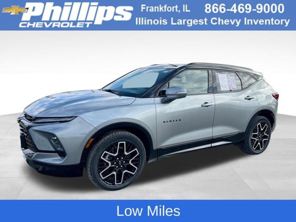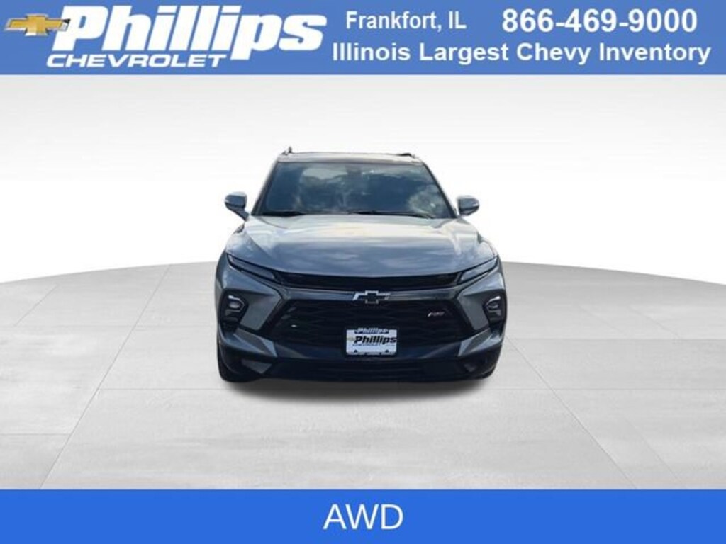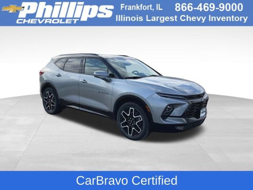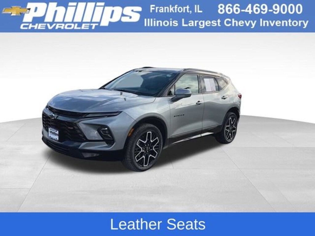 CarBravo Certified, Leather Seats, AWD, Priced Below Market, Trailering Package, Backup Camera, Remote Start, Pwr Dr Seat, Forward Collision Alert, Navigation, Bose Audio, Side Blind Zone Alert, Rear Cross Traffic Alert, Lane Departure Warning, Lane Change Alert, Lane Keep Assist, Rear Park Assist, Heated Seats, Heated Steering Wheel, Ventilated Seats, Memory Seating, Power Liftgate, Apple CarPlay, Aluminum Wheels, Carfax Buyback Guarantee, Blazer RS, 4D Sport Utility, 3.6L V6 SIDI, 9-Speed Automatic with Overdrive, AWD, Sterling Gray Metallic, Jet Black/Nightshift Blue w/Perforated Leather-Appointed Seat Trim, 4-Wheel Disc Brakes, 6-Way Power Front Passenger Seat Adjuster, 8-Way Power Driver Seat Adjuster, ABS brakes, Air Conditioning, AM/FM radio: SiriusXM with 360L, Apple CarPlay/Android Auto, Auto High-beam Headlights, Auto-dimming door mirrors, Auto-dimming Rear-View mirror, Automatic temperature control, Black 2-Tone Roof, Bose Premium 8-Speaker Audio System Feature, Brake assist, Bumpers: body-color, Child-Seat-Sensing Airbag, Compass, Driver door bin, Driver vanity mirror, Dual front impact airbags, Dual front side impact airbags, Electronic Stability Control, Emergency communication system: OnStar and Chevrolet connected services capable, Enhanced Convenience Package, Four wheel independent suspension, Front anti-roll bar, Front Bucket Seats, Front Center Armrest, Front dual zone A/C, Front reading lights, Fully automatic headlights, Garage door transmitter, Heated door mirrors, Heated Driver & Front Passenger Seats, Heated Rear Outboard Seating Positions, Heated Steering Wheel, Illuminated entry, Knee airbag, Leather Shift Knob, Leather steering wheel, Low tire pressure warning, Memory Settings For Driver Seat & Exterior Mirrors, Navigation System, Occupant sensing airbag, Outside temperature display, Overhead airbag, Overhead console, Passenger door bin, Passenger vanity mirror, Perforated Leather-Appointed Seat Trim, Power door mirrors, Power Driver Lumbar Control, Power Liftgate, Power passenger seat, Power Tilt & Telescoping Steering Column, Preferred Equipment Group 1RS, Premium audio system: Chevrolet Infotainment 3 Premium, Radio data system, Radio: Chevrolet Infotainment 3 Premium System, Rear anti-roll bar, Rear reading lights, Rear seat center armrest, Rear window defroster, Rear window wiper, Remote keyless entry, Ride & Handling Suspension, Security system, SiriusXM w/360L, Speed control, Speed-sensing steering, Split folding rear seat, Spoiler, Steering wheel mounted audio controls, Tachometer, Telescoping steering wheel, Tilt steering wheel, Traction control, Trip computer, Turn signal indicator mirrors, Variably intermittent wipers, Ventilated Driver & Front Passenger Seats, Voltmeter, Wheels: 21 High Gloss Black w/Machined Face. 2024 Chevrolet Blazer Sterling Gray Metallic RS 4D Sport Utility AWD 9-Speed Automatic with Overdrive 18/26 City/Highway MPG 3.6L V6 SIDI
