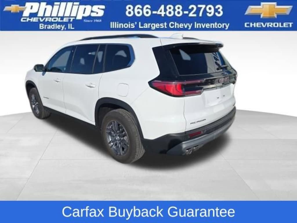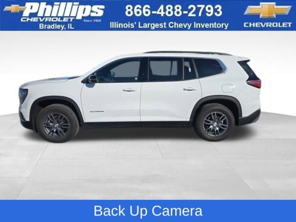 Carbravo Certified, Back Up Camera, Carfax Buyback Guarantee, Acadia Elevation, 4D Sport Utility, 2.5L DOHC, 8-Speed Automatic, FWD, Summit White, After Dark w/Cloth Seat Trim, 18 x 7.5 Aluminum Wheels, 2-Way Driver Power Lumbar Seat Adjuster, 3rd row seats: split-bench, 4-Way Manual Front Passenger Seat Adjuster, 4-Wheel Disc Brakes, 8-Passenger Seating (2-3-3 Seating Configuration), 8-Way Power Driver Seat Adjuster, ABS brakes, Air Conditioning, AM/FM radio: SiriusXM with 360L, Apple CarPlay/Android Auto, Auto High-beam Headlights, Auto-dimming Rear-View mirror, Automatic temperature control, Bodyside moldings, Bose Premium 12-Speaker System with Sub-Woofer, Brake assist, Bumpers: body-color, Cloth Seat Trim, Compass, Driver door bin, Driver vanity mirror, Dual front impact airbags, Dual front side impact airbags, Electronic Stability Control, Emergency communication system: OnStar Services capable, Exterior Parking Camera Rear, Four wheel independent suspension, Front anti-roll bar, Front Bucket Seats, Front Center Armrest, Front dual zone A/C, Front fog lights, Front reading lights, Fully automatic headlights, Heated door mirrors, Heated Driver and Front Passenger Seats, Heated steering wheel, Illuminated entry, Leather steering wheel, Low tire pressure warning, Navigation System, Occupant sensing airbag, Outside temperature display, Overhead airbag, Overhead console, Passenger door bin, Passenger vanity mirror, Power door mirrors, Power Liftgate, Preferred Equipment Group 4SC, Radio data system, Radio: 15 Diagonal Premium GMC Infotainment System, Rear air conditioning, Rear anti-roll bar, Rear reading lights, Rear seat center armrest, Rear side impact airbag, Rear window defroster, Rear window wiper, Remote keyless entry, Security system, SiriusXM with 360L, Speed control, Speed-sensing steering, Split folding rear seat, Spoiler, Sport steering wheel, Steering wheel mounted audio controls, Tachometer, Telescoping steering wheel, Tilt steering wheel, Traction control, Trip computer, Turn signal indicator mirrors, Variably intermittent wipers, Voltmeter. CARFAX One-Owner. Clean CARFAX. Certified. Summit White 2025 GMC Acadia Elevation FWD 8-Speed Automatic 2.5L DOHC20/27 City/Highway MPGCertification Program Details: Type your description hereWith the internet today, a great value shouldn't be hard to find. Here at Phillips Chevrolet we do the research for you. We monitor the market daily to ensure our customers are getting the best value achievable. We price all of our vehicles to make the buying process as simple and easy as possible. Our internet prices are just one factor that makes us the #1, #2, and out to be the #3 Chevrolet dealerships in Illinois. The future #3 Chevy dealership in Illinois is conveniently located at 1400 Locke Drive, the corner of I-57 & IL 50, in Bradley/Bourbonnais, IL 60914.