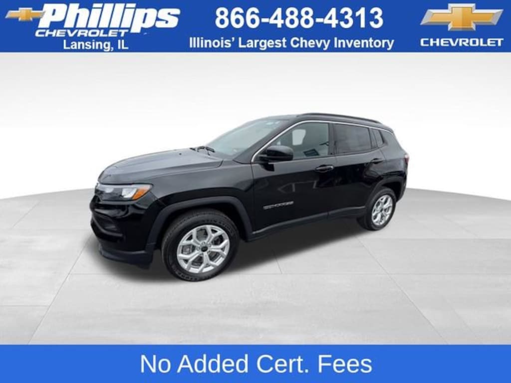 CarBravo Certified, ONE Owner!, Accident FREE, No Added Cert. Fees, Certified Multi-Point Inspection, 4WD!, Heated Seats, Apple CarPlay, Keyless Entry, Forward Collision Alert, Side Blind Zone Alert, Rear Cross Traffic Alert, Backup Camera, BLUETOOTH, Power Windows/Locks, Power Seating, PUSH BUTTON START!, Remote Start, 17 WHEELS!, Cruise Control, Carfax Buyback Guarantee, Customer Preferred Package 29J, Compass Latitude, 4D Sport Utility, 2.0L I4 DOHC, 8-Speed Automatic, 4WD, Diamond Black Crystal Pearlcoat, Black Cloth, 3.73 Final Drive Ratio, 4-Wheel Disc Brakes, 6 Speakers, ABS brakes, Air Conditioning, AM/FM radio: SiriusXM, Apple CarPlay/Android Auto, Brake assist, Bumpers: body-color, Compass, Driver door bin, Driver vanity mirror, Dual front impact airbags, Dual front side impact airbags, Electronic Stability Control, Emergency communication system: Jeep Connect, Four wheel independent suspension, Front anti-roll bar, Front Bucket Seats, Front Center Armrest w/Storage, Front reading lights, Fully automatic headlights, Heated door mirrors, Heated front seats, Heated steering wheel, Illuminated entry, Knee airbag, Leather Shift Knob, Leather steering wheel, Low tire pressure warning, Occupant sensing airbag, Outside temperature display, Overhead airbag, Overhead console, Panic alarm, ParkView Rear Back-Up Camera, Passenger door bin, Passenger vanity mirror, Power door mirrors, Power steering, Power windows, Premium audio system: UConnect 5, Premium Cloth/Vinyl Bucket Seats, Quick Order Package 29J, Radio: Uconnect 5 w/8.4 Display, Rear anti-roll bar, Rear seat center armrest, Rear window defroster, Rear window wiper, Remote keyless entry, Security system, Speed control, Split folding rear seat, Spoiler, Steering wheel mounted audio controls, Tachometer, Telescoping steering wheel, Tilt steering wheel, Traction control, Trip computer, Variably intermittent wipers, Wheels: 17 x 7 Aluminum (DISC). 2025 Jeep Compass Diamond Black Crystal Pearlcoat Latitude 4D Sport Utility 4WD 8-Speed Automatic 24/32 City/Highway MPG 2.0L I4 DOHC24/32 City/Highway MPGCertification Program Details: Type your description hereWith the internet today, a great value shouldnât be hard to find. Here at Phillips Chevrolet we do the research for you. We monitor the market daily to ensure our customers are getting the best value achievable. We price all of our vehicles to make the buying process as simple and easy as possible. Our internet prices are just one factor that makes us the #1, #2, and out to be the #3 Chevrolet dealerships in Illinois. The #2 Chevy dealership in Illinois is conveniently located just a one block south of 80/94, at 17730 S Torrence Avenue in Lansing, IL 60438.