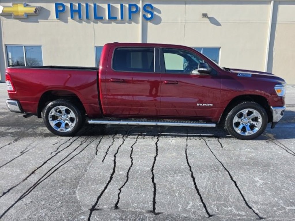 Low Miles, CarBravo Certified, 4WD, Bucket Seats w/ Center Console, Trailering Package, Backup Camera, Remote Start, Pwr Dr Seat, Heated Seats, Heated Steering Wheel, Apple CarPlay, 20 Wheels, Carfax Buyback Guarantee, 1500 Big Horn/Lone Star, 4D Crew Cab, 3.6L V6 24V VVT, 8-Speed Automatic, 4WD, Delmonico Red Pearlcoat, Black w/Cloth High-Back Bucket Seats, 115V Auxiliary Power Outlet, 115V Auxiliary Rear Power Outlet, 2nd Row In Floor Storage Bins, 3 Rear Seat Head Restraints, 4 Way Front Headrests, 4-Wheel Disc Brakes, 48V Belt Starter Generator, 4G LTE Wi-Fi Hot Spot, 6 Speakers, 8.4 Touchscreen Display, ABS brakes, Air Conditioning ATC w/Dual Zone Control, AM/FM radio, Apple CarPlay, Auto-Dimming Exterior Driver Mirror, Auto-Dimming Rear-View Mirror, Big Horn Badge, Big Horn Level 2 Equipment Group, Black Exterior Mirrors, Black Premium Power Mirrors, Bluetooth Handsfree Phone & Audio, Brake assist, Bucket Seats, Bumpers: chrome, Class IV Receiver Hitch, Cluster 7.0 TFT Color Display, Compass, Connectivity - US/Canada, Convex Wide-Angle Mirror Insert, Driver door bin, Dual front impact airbags, Dual front side impact airbags, Electronic Stability Control, Emergency communication system: SiriusXM Guardian, Exterior Mirrors Courtesy Lamps, Exterior Mirrors w/Heating Element, Exterior Mirrors w/Supplemental Signals, For Details, Visit DriveUconnect.com, Front anti-roll bar, Front Center Armrest w/Storage, Front fog lights, Front reading lights, Front Seat Back Map Pockets, Front wheel independent suspension, Fully automatic headlights, Global Telematics Box Module (TBM), Glove Box Lamp, Google Android Auto, GPS Antenna Input, Heated door mirrors, Heated Front Seats, Heated Steering Wheel, Illuminated entry, Integrated Center Stack Radio, Integrated Voice Command w/Bluetooth, Leather steering wheel, Low tire pressure warning, Media Hub w/2 Charge Only USBs, Occupant sensing airbag, Outside temperature display, Overhead airbag, Overhead console, Panic alarm, ParkSense Front/Rear Park Assist w/Stop, ParkView Rear Back-Up Camera, Passenger door bin, Passenger vanity mirror, Power 2-Way Driver Lumbar Adjust, Power 8-Way Driver Seat, Power Adjustable Pedals, Power door mirrors, Power-Folding Mirrors, Quick Order Package 23Z Big Horn, Radio: Uconnect 5 W w/8.4 Display, Rear 60/40 Folding Seat, Rear anti-roll bar, Rear Dome w/On/Off Switch Lamp, Rear Power Sliding Window, Rear seat center armrest, Rear step bumper, Rear Window Defroster, Remote Start System, Security Alarm, SiriusXM Radio Service, SiriusXM Satellite Radio, Speed control, Split folding rear seat, Steering wheel mounted audio controls, Sun Visors w/Illuminated Vanity Mirrors, Tachometer, Telescoping steering wheel, Tilt steering wheel, Traction control, Trip computer, Universal Garage Door Opener, USB Host Flip, Variably intermittent wipers, Voltmeter, Wheels: 20 x 9 Aluminum Chrome Clad (WRK). 2022 Ram 1500 Delmonico Red Pearlcoat Big Horn/Lone Star 4D Crew Cab 4WD 8-Speed Automatic 19/24 City/Highway MPG 3.6L V6 24V VVTCertification Program Details: Type your description hereWith the internet today, a great value shouldnât be hard to find. Here at Phillips Chevrolet we do the research for you. We monitor the market daily to ensure our customers are getting the best value achievable. We price all of our vehicles to make the buying process as simple and easy as possible. Our internet prices are just one factor that makes us the #1, #2, and out to be the #3 Chevrolet dealerships in Illinois. The #2 Chevy dealership in Illinois is conveniently located just a one block south of 80/94, at 17730 S Torrence Avenue in Lansing, IL 60438.