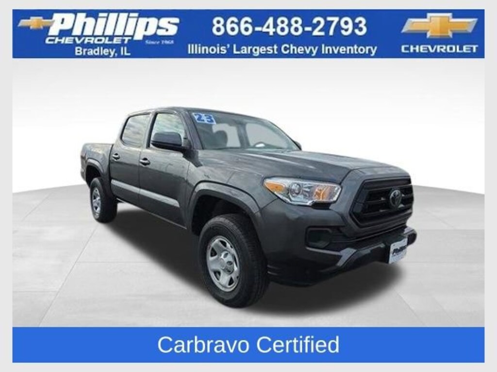 Carbravo Certified, Certifed Multi Point Inspection, One Owner, Carfax- Accident Free, Fully Serviced, Apple CarPlay, Android Auto, 4WD, Back Up Camera, Bluetooth, Cruise Control, Power Locks, Carfax Buyback Guarantee, Tacoma SR V6, 4D Double Cab, 3.5L V6 PDI DOHC 24V LEV3-ULEV70 278hp, 6-Speed Automatic, 4WD, Magnetic Gray Metallic, Black w/Fabric Seat Trim, 16 Styled Steel Wheels, 6 Speakers, ABS brakes, Air Conditioning, AM/FM radio: SiriusXM, Anti-whiplash front head restraints, Apple CarPlay/Android Auto, Auto High-beam Headlights, Automatic temperature control, Axle Ratio: 3.91, Brake assist, Bumpers: body-color, Driver door bin, Dual front impact airbags, Dual front side impact airbags, Electronic Stability Control, Emergency communication system: Safety Connect (1-year trial), Exterior Parking Camera Rear, Fabric Seat Trim, Front anti-roll bar, Front Bucket Seats, Front Center Armrest, Front dual zone A/C, Front reading lights, Front Seats, Front wheel independent suspension, Heated door mirrors, Illuminated entry, Knee airbag, Low tire pressure warning, Occupant sensing airbag, Outside temperature display, Overhead airbag, Overhead console, Passenger door bin, Power door mirrors, Power steering, Power windows, Radio: Audio, Rear step bumper, Speed control, Speed-sensing steering, Split folding rear seat, Steering wheel mounted audio controls, Tachometer, Telescoping steering wheel, Tilt steering wheel, Traction control, Variably intermittent wipers. CARFAX One-Owner. Clean CARFAX. Certified. Magnetic Gray Metallic 2023 Toyota Tacoma SR V6 4WD 6-Speed Automatic 3.5L V6 PDI DOHC 24V LEV3-ULEV70 278hpOdometer is 3927 miles below market average!Certification Program Details: Type your description hereWith the internet today, a great value shouldn't be hard to find. Here at Phillips Chevrolet we do the research for you. We monitor the market daily to ensure our customers are getting the best value achievable. We price all of our vehicles to make the buying process as simple and easy as possible. Our internet prices are just one factor that makes us the #1, #2, and out to be the #3 Chevrolet dealerships in Illinois. The future #3 Chevy dealership in Illinois is conveniently located at 1400 Locke Drive, the corner of I-57 & IL 50, in Bradley/Bourbonnais, IL 60914.