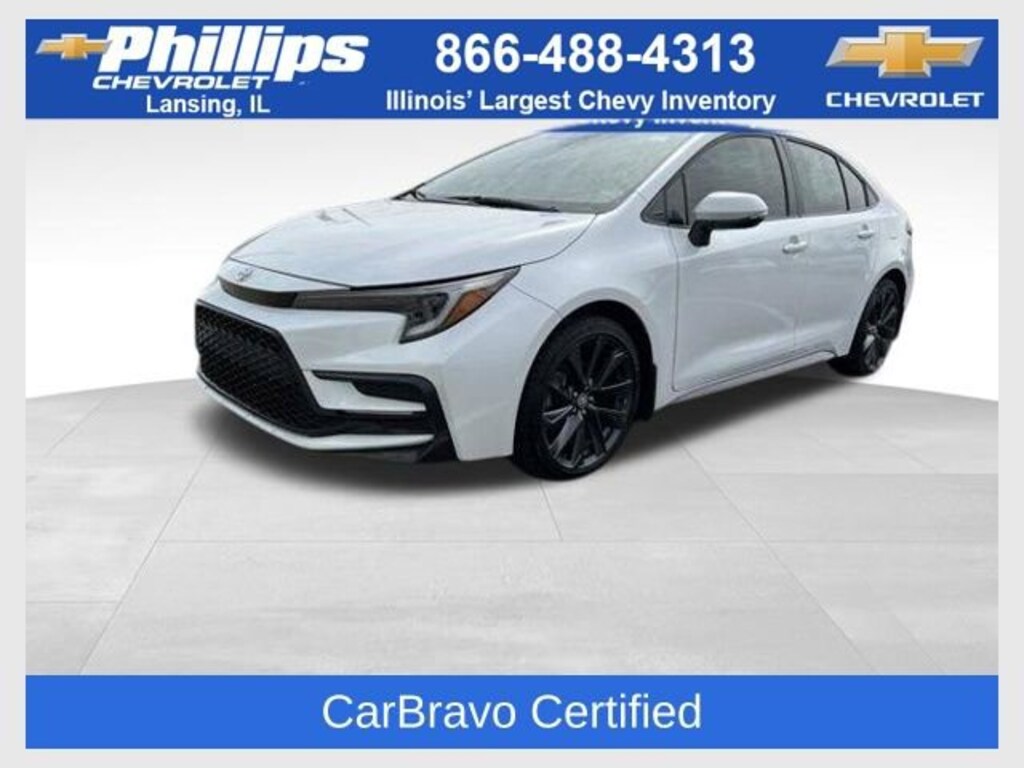 CarBravo Certified, ONE Owner!, Accident FREE, No Added Cert. Fees, Certified Multi-Point Inspection, Sunroof, Heated Seats, Apple CarPlay, Keyless Entry, Side Blind Zone Alert, Rear Cross Traffic Alert, Backup Camera, BLUETOOTH, Power Windows/Locks, Power Seating, PUSH BUTTON START!, GAS SAVER!, 18 WHEELS!, Carfax Buyback Guarantee, JBL AUDIO, Corolla XSE, 4D Sedan, 2.0L I4 DOHC 16V, CVT, FWD, Wind Chill Pearl, Black/Red w/SofTex Seat Trim, 4-Wheel Disc Brakes, 6 Speakers, ABS brakes, Air Conditioning, AM/FM radio: SiriusXM, Automatic temperature control, Brake assist, Bumpers: body-color, Driver door bin, Driver vanity mirror, Dual front impact airbags, Dual front side impact airbags, Electronic Stability Control, Emergency communication system: Safety Connect (up to 10-year trial subscription), Exterior Parking Camera Rear, Four wheel independent suspension, Front anti-roll bar, Front Bucket Seats, Front Center Armrest, Front reading lights, Fully automatic headlights, Heated door mirrors, Heated Front Sport Seats, Illuminated entry, Knee airbag, Leather steering wheel, Low tire pressure warning, Occupant sensing airbag, Outside temperature display, Overhead airbag, Panic alarm, Passenger door bin, Passenger vanity mirror, Power door mirrors, Power driver seat, Power moonroof, Power steering, Power windows, Radio data system, Radio: 8 Toyota Audio Multimedia, Rear anti-roll bar, Rear seat center armrest, Rear side impact airbag, Rear window defroster, Remote keyless entry, SofTex Seat Trim, Speed control, Split folding rear seat, Spoiler, Steering wheel mounted audio controls, Tachometer, Telescoping steering wheel, Tilt steering wheel, Traction control, Trip computer, Turn signal indicator mirrors, Variably intermittent wipers, Wheels: 18 Alloy w/Graphite-Colored Finish. 2024 Toyota Corolla Wind Chill Pearl XSE 4D Sedan FWD CVT 31/40 City/Highway MPG 2.0L I4 DOHC 16V31/40 City/Highway MPG Recent Arrival!Certification Program Details: Type your description hereWith the internet today, a great value shouldnât be hard to find. Here at Phillips Chevrolet we do the research for you. We monitor the market daily to ensure our customers are getting the best value achievable. We price all of our vehicles to make the buying process as simple and easy as possible. Our internet prices are just one factor that makes us the #1, #2, and out to be the #3 Chevrolet dealerships in Illinois. The #2 Chevy dealership in Illinois is conveniently located just a one block south of 80/94, at 17730 S Torrence Avenue in Lansing, IL 60438.