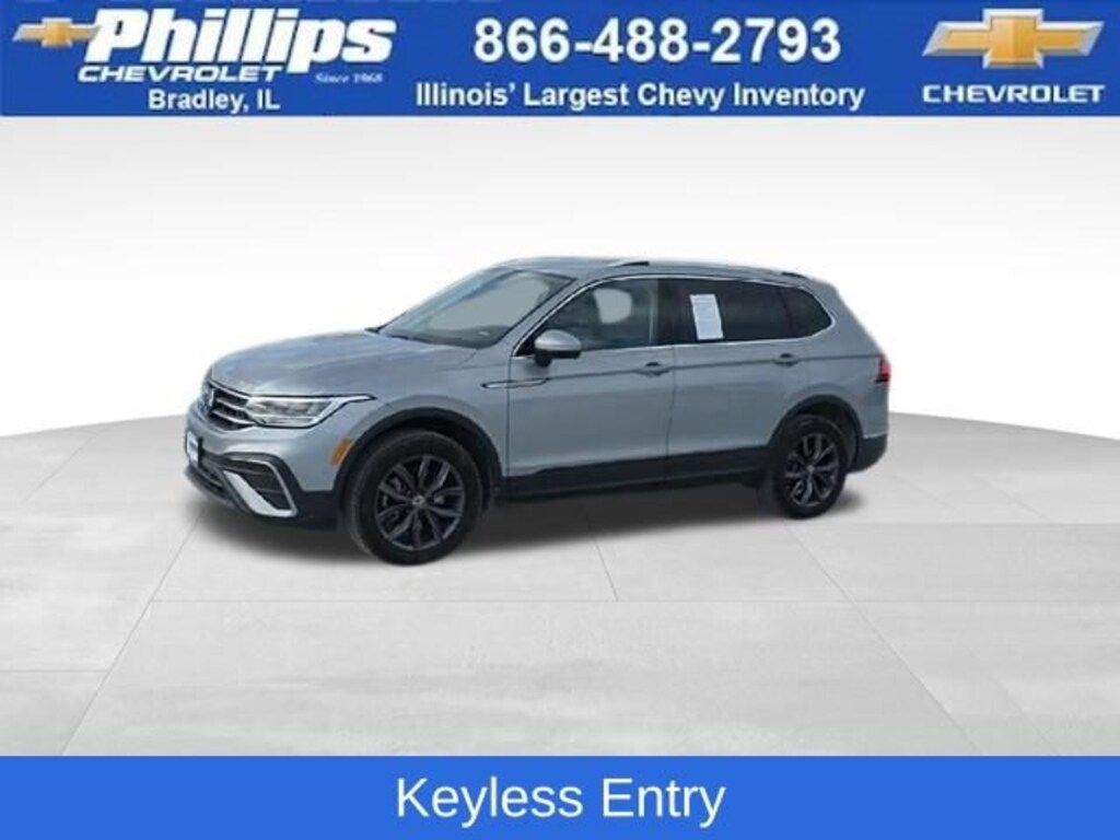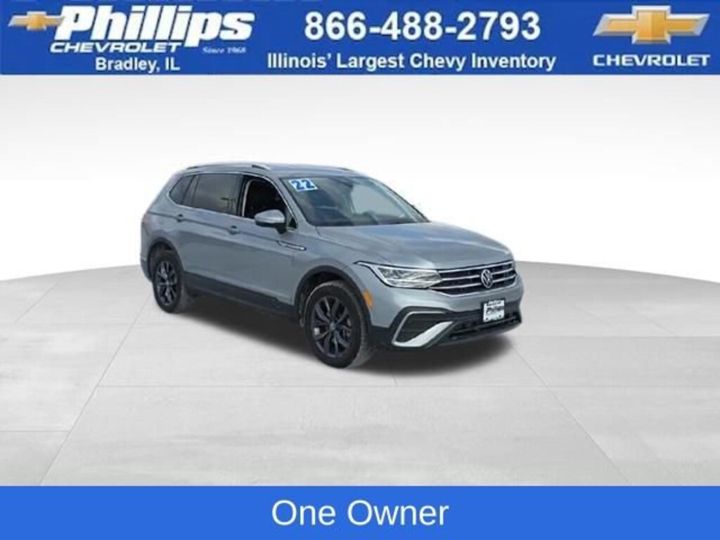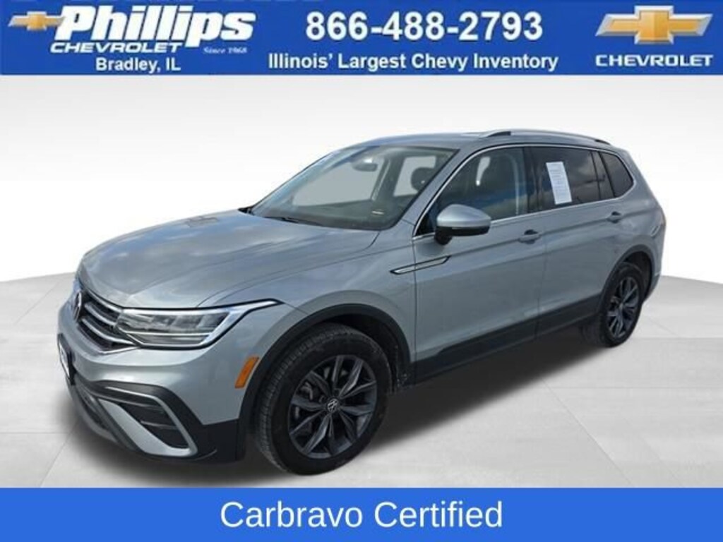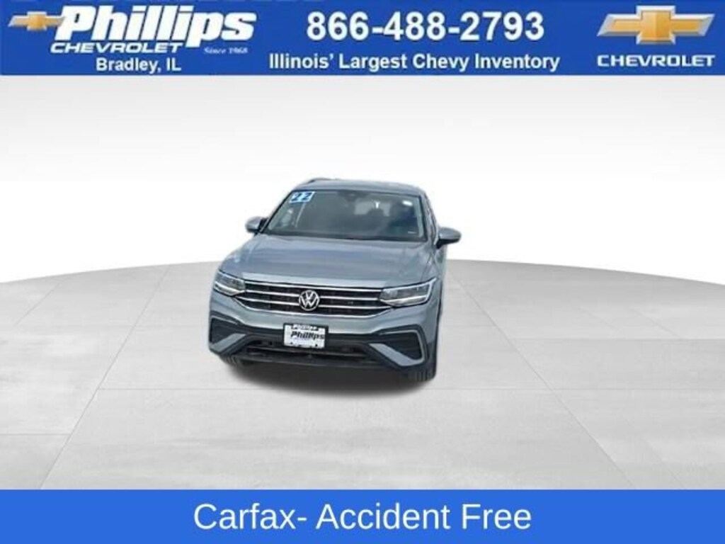 Carbravo Certified, One Owner, Carfax- Accident Free, Keyless Entry, Auto Check - Accident free, AWD, Back Up Camera, Bluetooth, Cruise Control, Power Locks, Power Windows, Carfax Buyback Guarantee, Tiguan 2.0T SE, 4D Sport Utility, 2.0L TSI DOHC, 8-Speed Automatic with Tiptronic, AWD, Pyrite Silver Metallic, Titan Black w/Perforated V-Tex Leatherette Seating Surfaces, 3.33 Axle Ratio, 4-Wheel Disc Brakes, 4-Wheel Independent Suspension, 6 Speakers, ABS brakes, Air Conditioning, Auto-dimming Rear-View mirror, Automatic temperature control, Brake assist, Bumpers: body-color, Compass, Driver door bin, Driver vanity mirror, Dual front impact airbags, Dual front side impact airbags, Electronic Stability Control, Emergency communication system: Car-Net, Exterior Parking Camera Rear, Four wheel independent suspension, Front anti-roll bar, Front Center Armrest, Front dual zone A/C, Front reading lights, Fully automatic headlights, Heated door mirrors, Heated Front Comfort Seats, Illuminated entry, Leather Shift Knob, Low tire pressure warning, Occupant sensing airbag, Outside temperature display, Overhead airbag, Overhead console, Passenger door bin, Passenger vanity mirror, Perforated V-Tex Leatherette Seating Surfaces, Power door mirrors, Power driver seat, Power Liftgate, Radio data system, Radio: MIB3 Composition Media AM/FM/HD, Rain sensing wipers, Rear anti-roll bar, Rear reading lights, Rear seat center armrest, Rear window defroster, Rear window wiper, Remote keyless entry, Roof rack: rails only, Security system, Speed control, Speed-sensing steering, Split folding rear seat, Spoiler, Steering wheel mounted audio controls, Tachometer, Telescoping steering wheel, Tilt steering wheel, Traction control, Trip computer, Turn signal indicator mirrors, Variably intermittent wipers, Wheels: 18 Dark Graphite 10-Spoke Alloy. CARFAX One-Owner. Clean CARFAX. Certified. Pyrite Silver Metallic 2022 Volkswagen Tiguan 2.0T SE AWD 8-Speed Automatic with Tiptronic 2.0L TSI DOHCOdometer is 24391 miles below market average! 22/29 City/Highway MPGCertification Program Details: Type your description hereWith the internet today, a great value shouldn't be hard to find. Here at Phillips Chevrolet we do the research for you. We monitor the market daily to ensure our customers are getting the best value achievable. We price all of our vehicles to make the buying process as simple and easy as possible. Our internet prices are just one factor that makes us the #1, #2, and out to be the #3 Chevrolet dealerships in Illinois. The future #3 Chevy dealership in Illinois is conveniently located at 1400 Locke Drive, the corner of I-57 & IL 50, in Bradley/Bourbonnais, IL 60914.